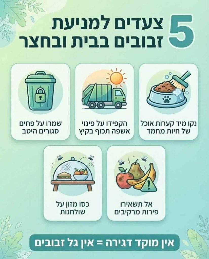 - אזור האכלת חיות: לא להשאיר מזון רטוב בחוץ, לנקות קערות, ולנהל את הפינה כך שלא תמשוך זבובים.