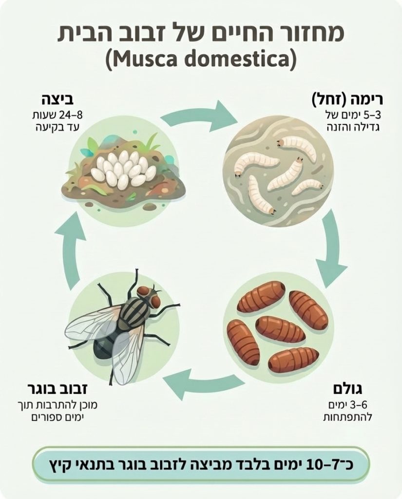 Toggleהבעיה היא שזבובים לא נעלמים לבד אם יש להם תנאים טובים. מספיק פח אשפה שלא נסגר היטב, שאריות מזון בגינה, קומפוסט, גללי בעלי חיים בסביבה, או אפילו פירות שמבשילים מהר בקיץ – והבית הופך ליעד קבוע. לכן טיפול נכון מתחיל בהבנה: מאיפה הם מגיעים, איפה הם מתרבים, ואיך מפסיקים את מחזור החיים שלהם.