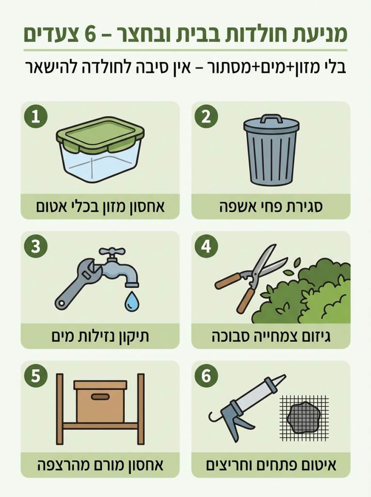 - מטפלים באשפה: פח חוץ עם מכסה נסגר היטב, בלי שקיות קרועות, ופינוי תכוף.