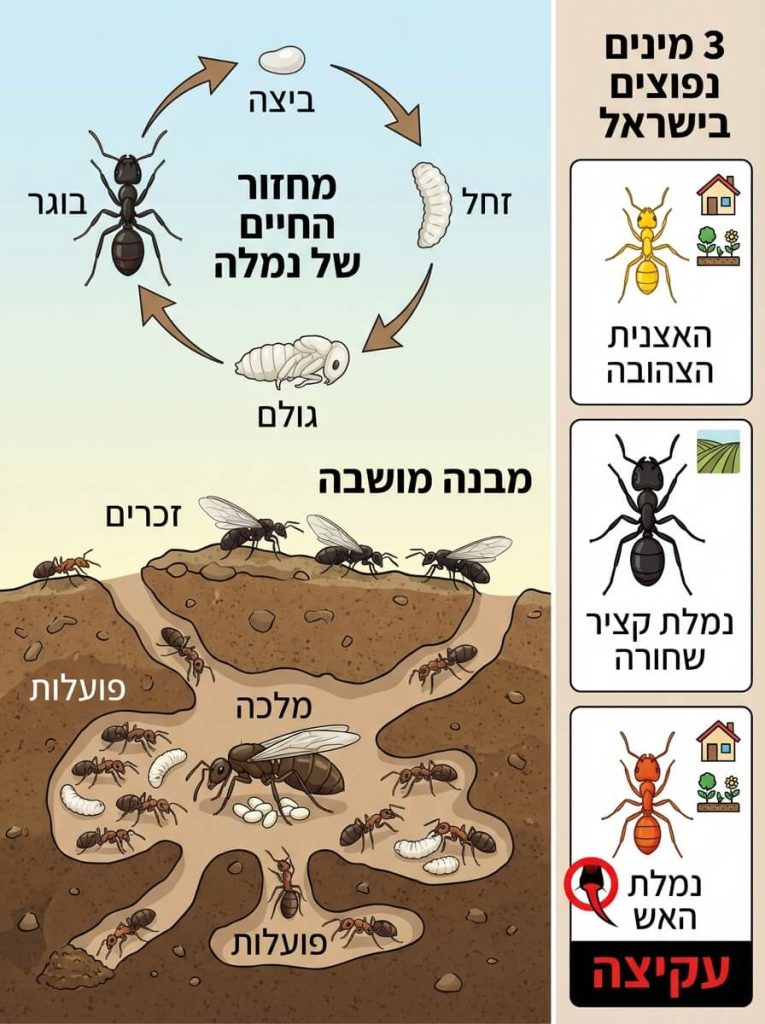 נמלים הן חרקים חברתיים שחיים במושבות מאורגנות: מלכה (או מלכות), פועלות וזכרים בעונת רבייה. הן עוברות גלגול מלא: ביצה, זחל, גולם ובוגר. זה אומר שהקן מייצר דורות חדשים כל הזמן, ואם לא פוגעים בלב המושבה, תראו חזרתיות.