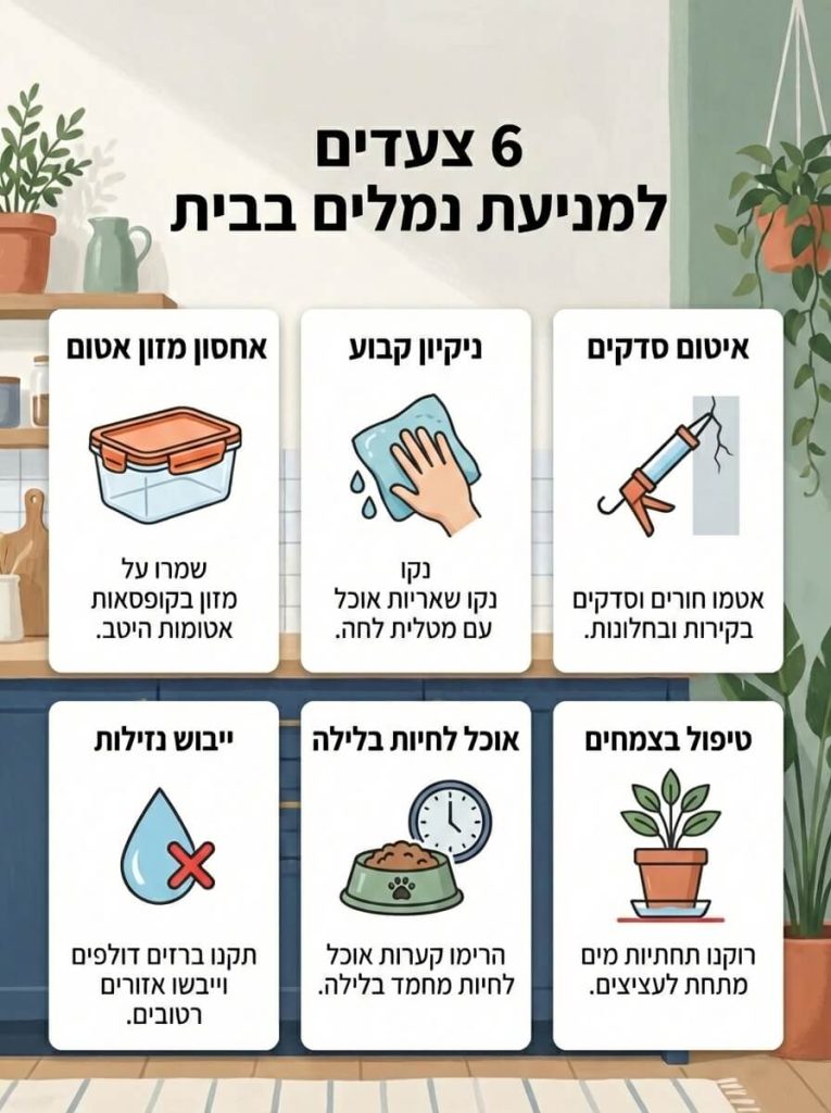 החדשות הטובות: ברוב הבתים אפשר לצמצם מאוד את הסיכוי לפלישה חוזרת עם כמה הרגלים פשוטים. לא צריך להפוך את הבית למעבדה סטרילית – רק למנוע מנמלים את הגישה למקורות מזון.