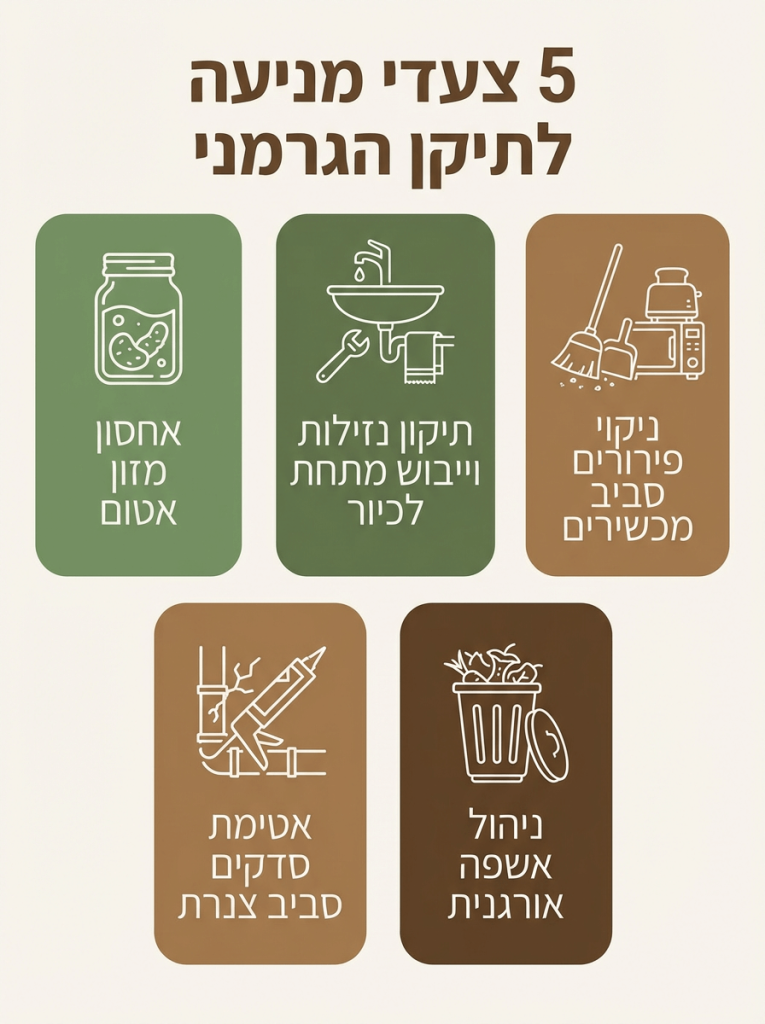 מים ולחות: תקנו נזילות קטנות, יבשו אזור מתחת לכיור, בדקו עיבוי מים מאחורי מקרר/מדיח, ורוקנו מגש טפטוף אם יש.