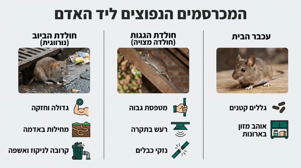 בישראל יש מגוון רחב של מכרסמים שחיים בטבע, בשטחים פתוחים וגם ממש ליד בני אדם. רובם בכלל לא “מזיקים” ביום־יום, אבל כשהם מוצאים מקור קבוע של מזון, מים ומסתור – הם יכולים להפוך במהירות לבעיה בבית, בבניין, במחסן, בחצר או בעסק. מעבר לנזק לרכוש (כרסום כבלים, בידוד ועץ), מכרסמים עלולים גם לזהם מזון ולהשאיר אחריהם גללים וריחות.