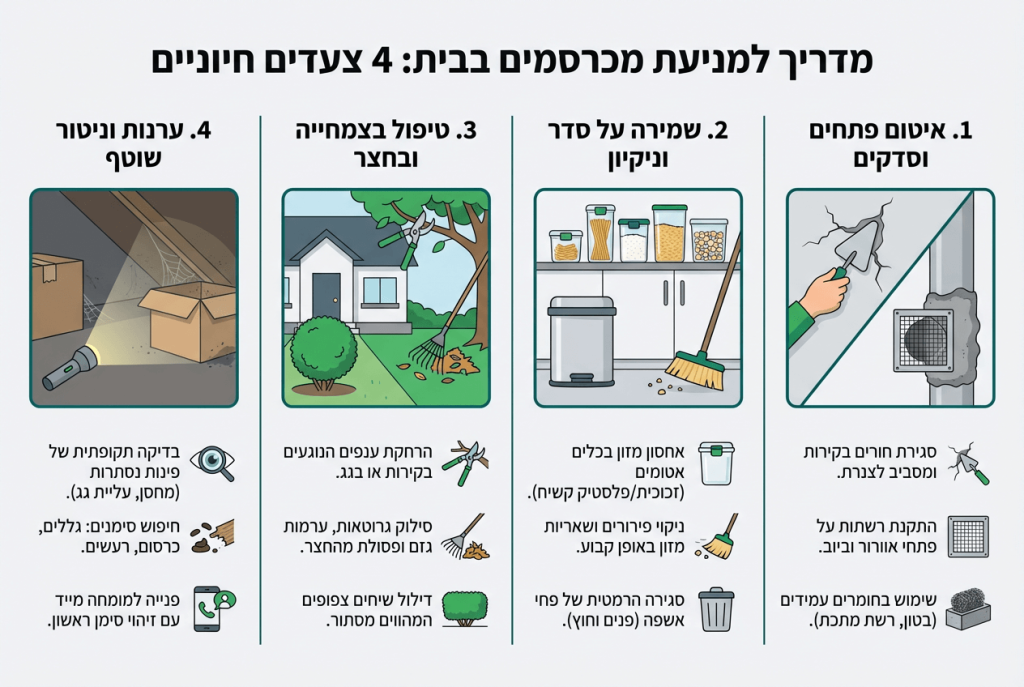גם אשפה היא גורם משיכה מרכזי—השתמשו בפחים עם מכסה סגור היטב בבית ובחצר והוציאו אשפה באופן קבוע. בחוץ, צמצמו מקומות מסתור באמצעות גיזום צמחייה צמודה לקירות, פינוי ערימות קרשים/קרטונים ואחסון ציוד במחסן על מדפים ולא על הרצפה. לבסוף, טפלו במקורות מים ולחות כמו נזילות, טפטפות דולפות או אזורים רטובים מתחת לכיור. אם מופיעים סימנים מוקדמים כמו גללים, כרסומים או רעשים בלילה—עדיף לטפל מיד, לפני שהבעיה מתבססת.